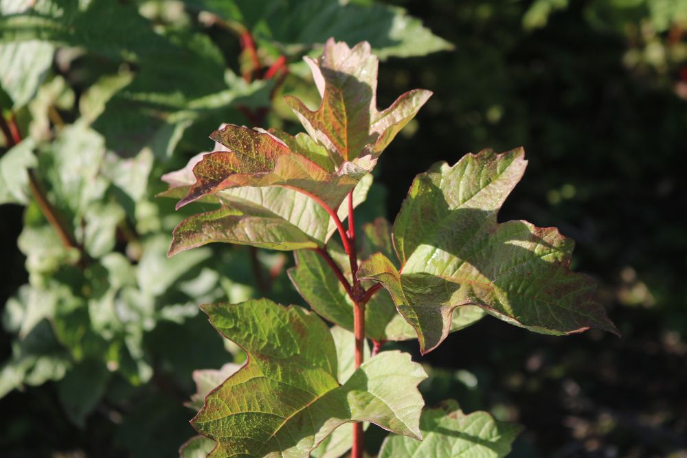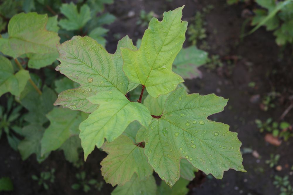 laubabwerfend Blätter: schönes frisches Grün, ca. 6-12cm lang, 5-10 cm breit junge Blätter mit rötlichem Anstrich, ahornförmig
