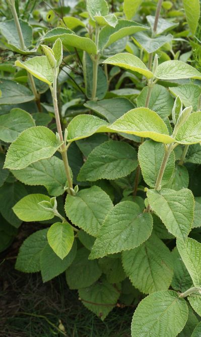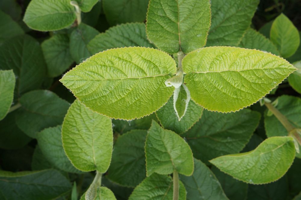 laubabwerfend Blätter: eiförmig oben frisch grün, samtig, von unten mit feinem Staub besetzt